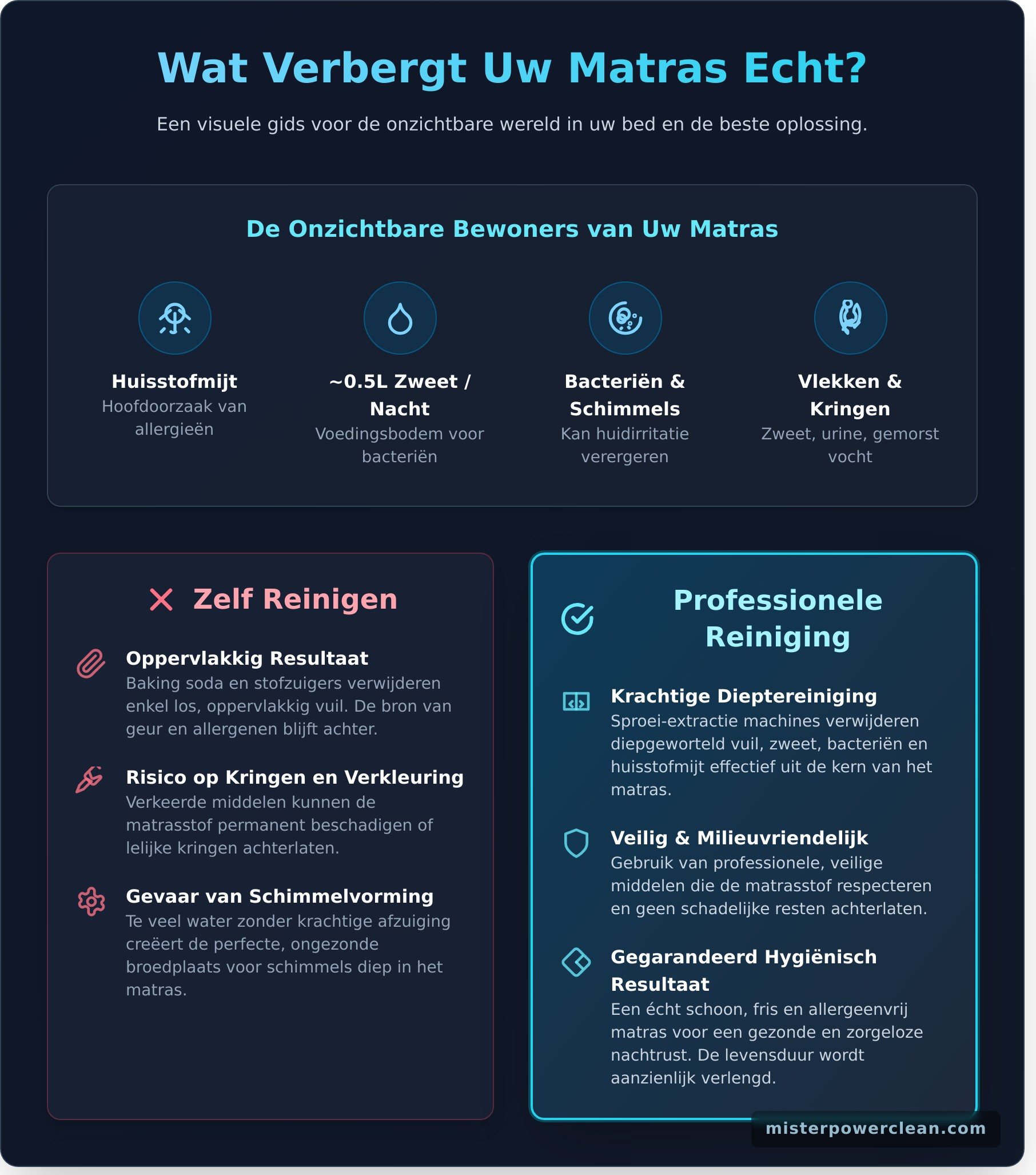 U brengt gemiddeld een derde van uw leven door in bed. Op het eerste gezicht lijkt uw matras misschien schoon, maar de realiteit is anders. Iedere nacht verliest u ongeveer een halve liter zweet, dat samen met huidschilfers en lichaamsoliën diep in de vezels van uw matras trekt. Dit creëert een ideale, warme en vochtige omgeving waar onzichtbaar vuil zich razendsnel kan vermenigvuldigen. Een standaard schoonmaakbeurt met de stofzuiger is helaas niet voldoende om dit diepgewortelde probleem aan te pakken.