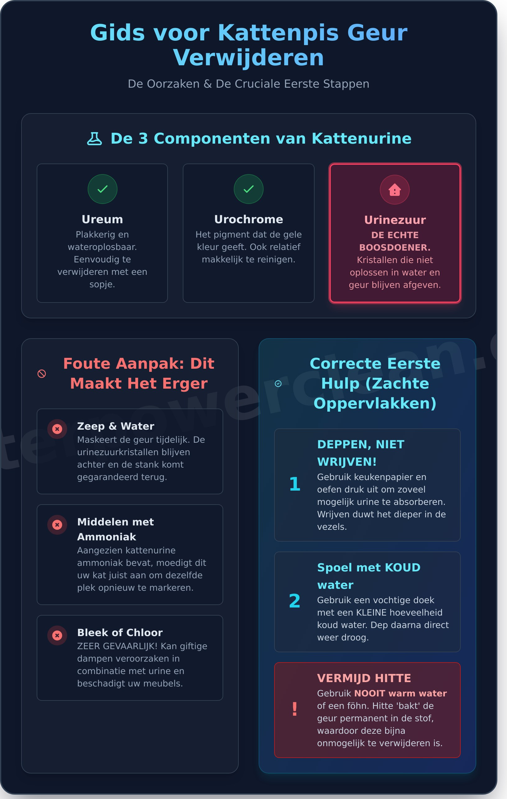 Kortom, de hardnekkigheid zit hem in de chemische samenstelling. Alleen een methode die de urinezuurkristallen volledig afbreekt, kan de geur voorgoed elimineren.